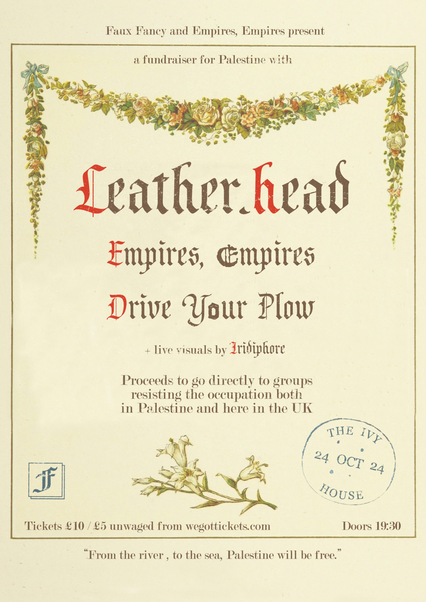 We come together for a night of live music and solidarity in the hallowed halls of Nunhead institution, The Ivy House, for a fundraiser show in support of groups resisting the occupation both in Palestine and here in the UK. Live music from LEATHER.HEAD EMPIRES, EMPIRES DRIVE YOUR PLOW + live visuals from Iridiphore Tickets […]