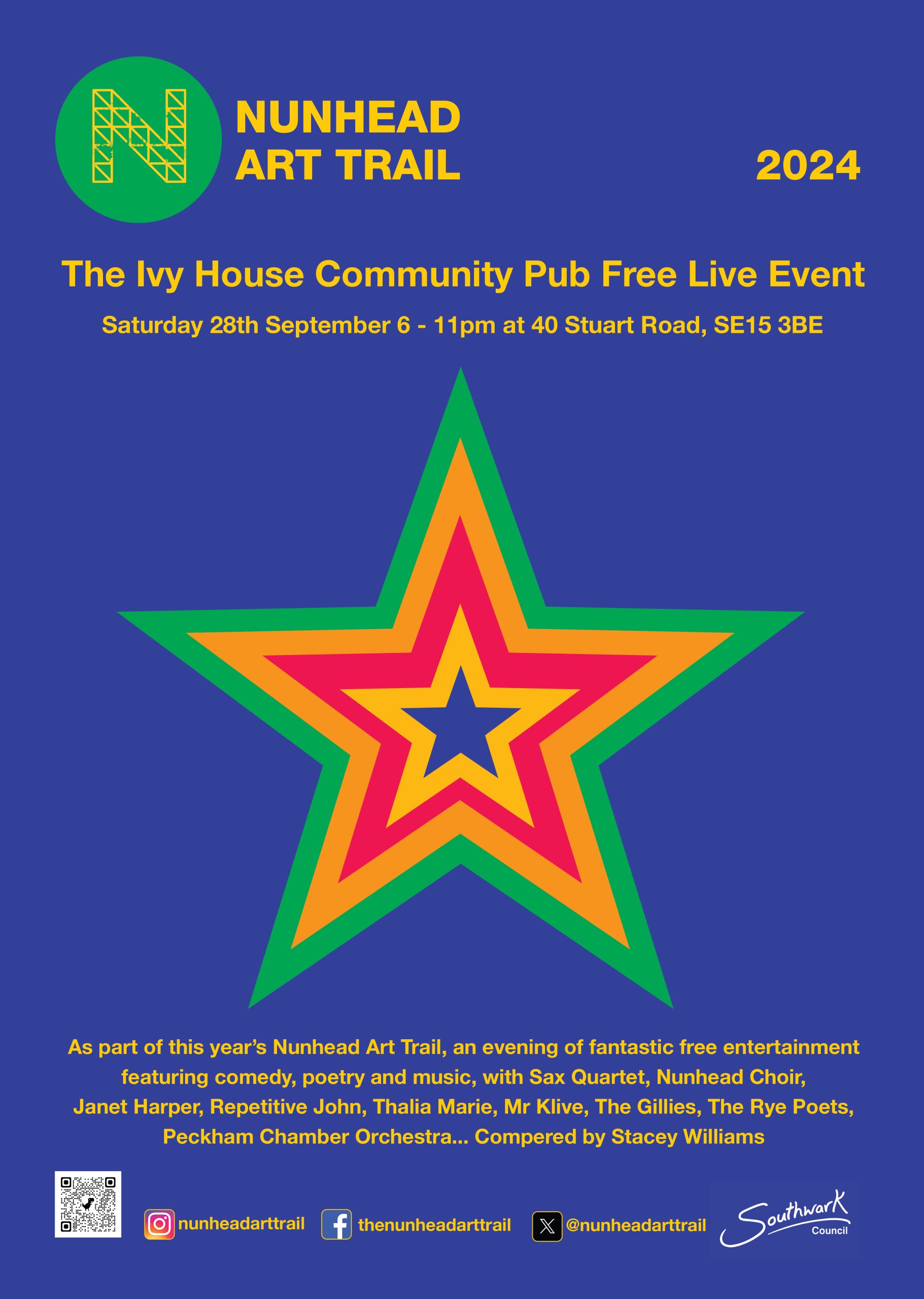 As part of this year’s Nunhead Art Trail, an evening of fantastic free entertainment featuring comedy, poetry and music, with Sax Quartet, Nunhead Choir, Janet Harper, Repetitive John, Thalia Marie, Mr Klive, The Gillies, The Rye Poets, Peckham Chamber Orchestra... Compered by Stacey Williams.