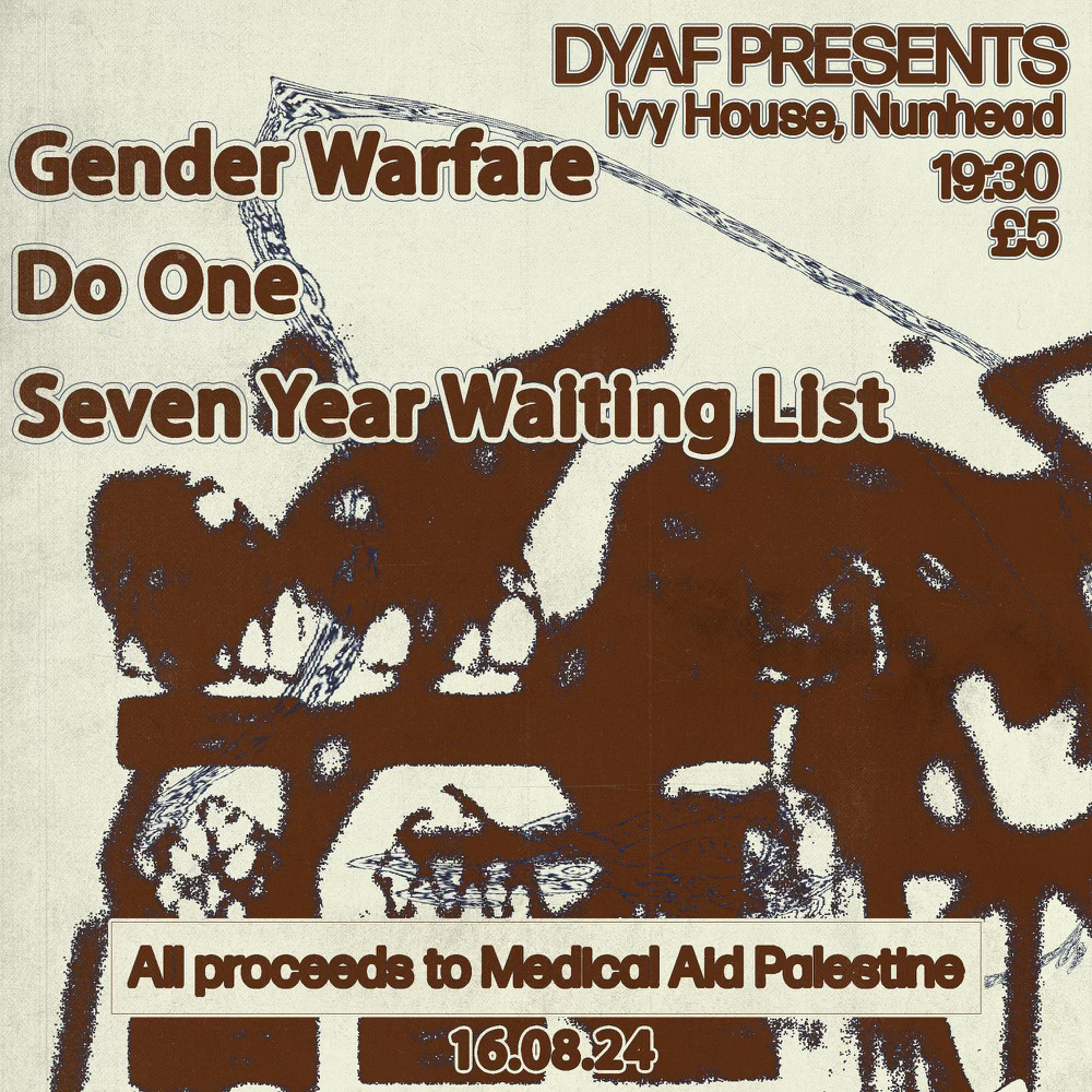 GENDER WARFARE DO ONE SEVEN YEAR WAITING LIST £5 Donation Entry All proceeds go to Medical Aid Palestine