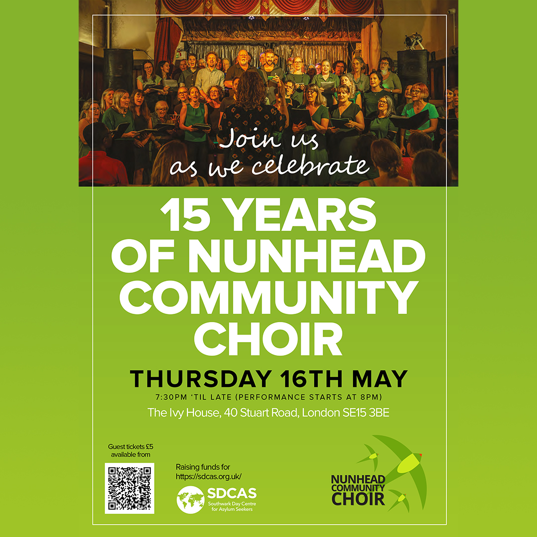 Join us as we celebrate 15 years of the Nunhead Community Choir Tickets are £5, which will be raising funds for SDCAS (Southwark Day Centre for Asylum Seekers). Do come along, it's going to be special. Scan the QR code on the poster to get your ticket!